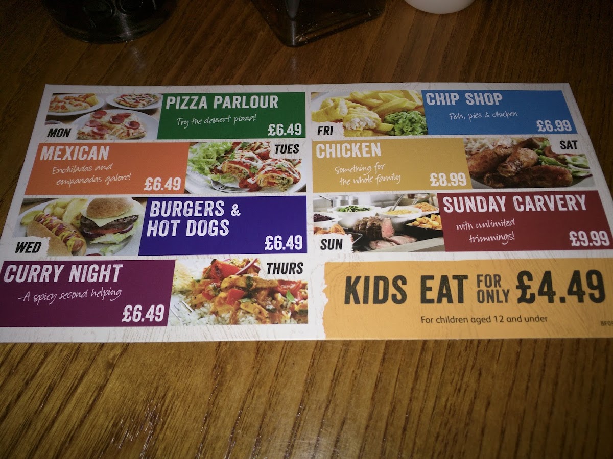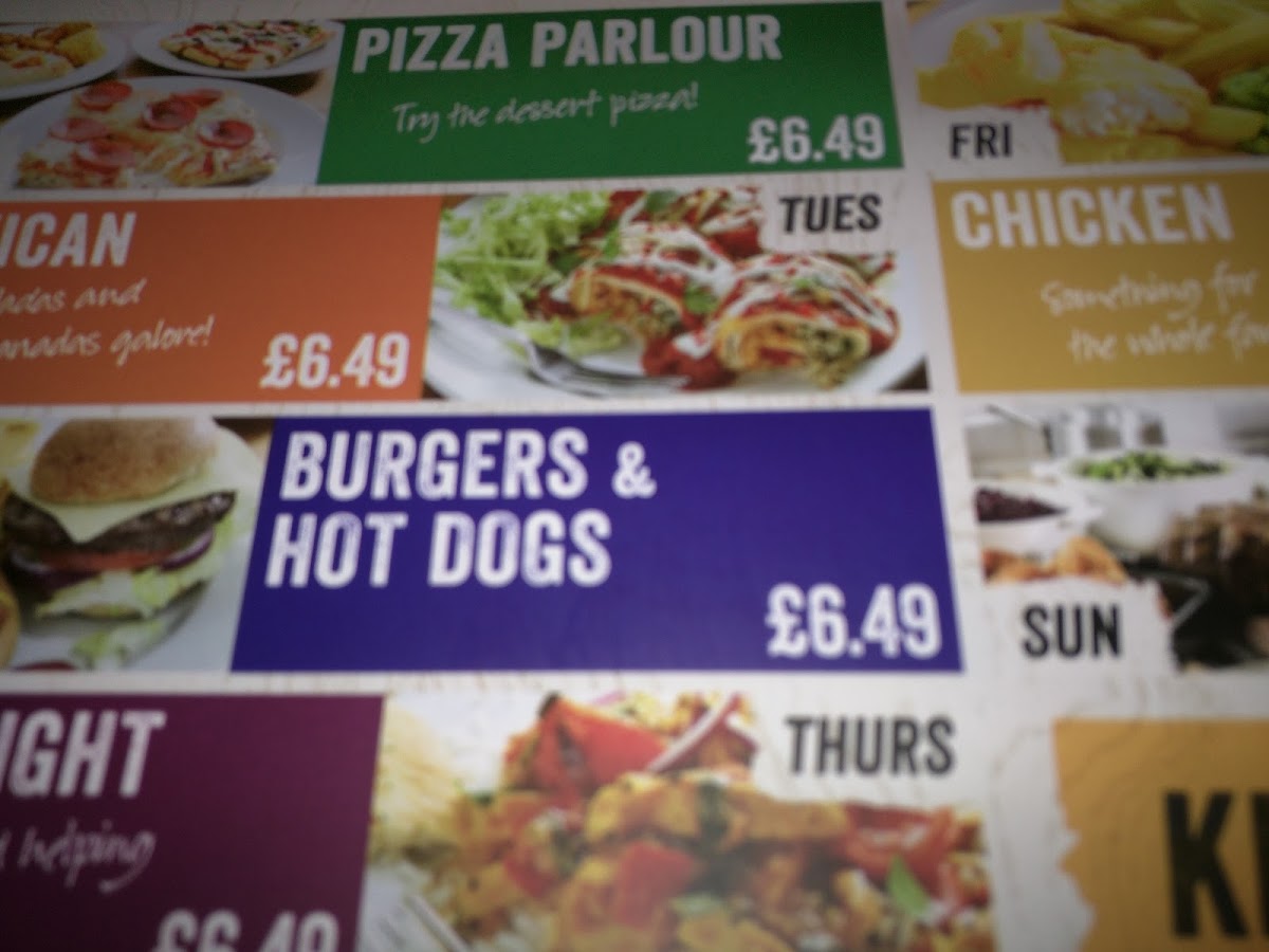4oz* rump steak, two pork sausages, half a chicken breast and half a gammon steak. Served with beer-battered onion rings§, half a grilled tomato, two fried eggs, garden peas and skin-on chips (1,221kcal)